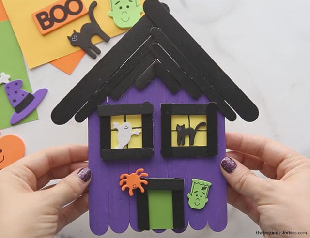 Make a haunted house out of popsicle sticks! Decorate with Halloween stickers.